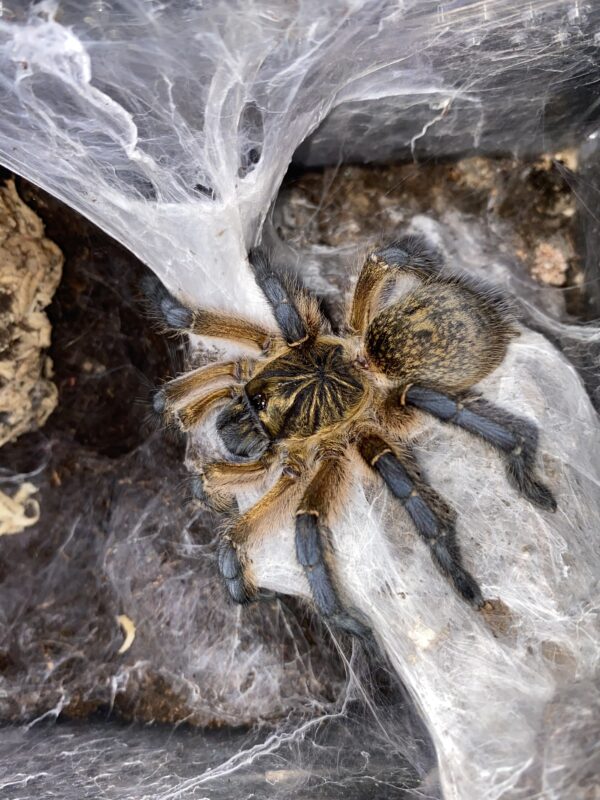 The Golden Blue Leg Baboon features a breathtaking combination of colors that sets it apart from other species. Its golden carapace and bold metallic blue legs make it a favorite among collectors and enthusiasts. This tarantula’s vibrant hues are even more striking under natural or artificial light, making it a true showpiece in any collection.